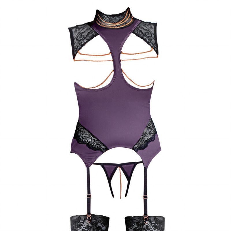 Open cup and backless basque from Abierta Fina made out of stretchy purple satin with delicate lace inserts and a lace choker with 2 buttons. The choker has 3 decorative chains at the front. There are also decorative, rose-gold coloured chains over the open cups and cut-out at the back. The chains can snap hooks which means that they can be removed.