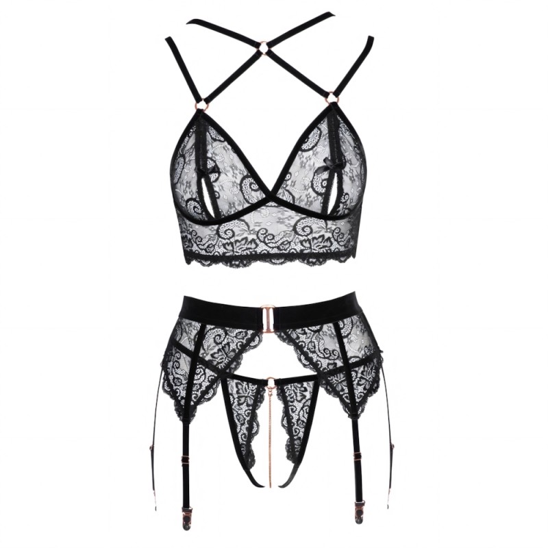 Bra, suspender belt and crotchless string from Abierta Fina made out of stretchy black lace with velvet details and rose-gold coloured accessories. The bra is longer than normal bras and has slitted cups with small hook fasteners underneath the satin bows. There is also a hook fastener at the back.