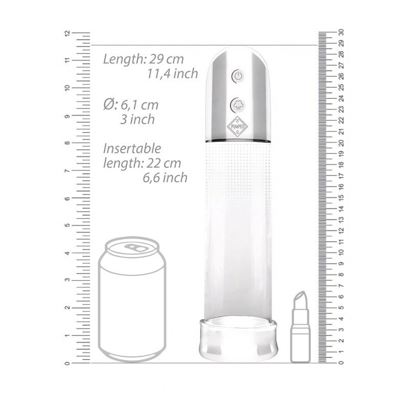 With a total cylinder length of 20cm 7.8 inches and an inner diameter of 6 cm, 2.36 inches, this high-quality pump gives you ample possibilities to grow in both directions! The insertion sleeve is made of smooth Silicone. Surprise yourself every time on how big you can get! At the touch of a button, the extremely powerful pump will create a super-strong vacuum, giving you a quick and powerful erection. The soft silicone opening will create a tight yet comfortable seal. Takes 2 AA batteries