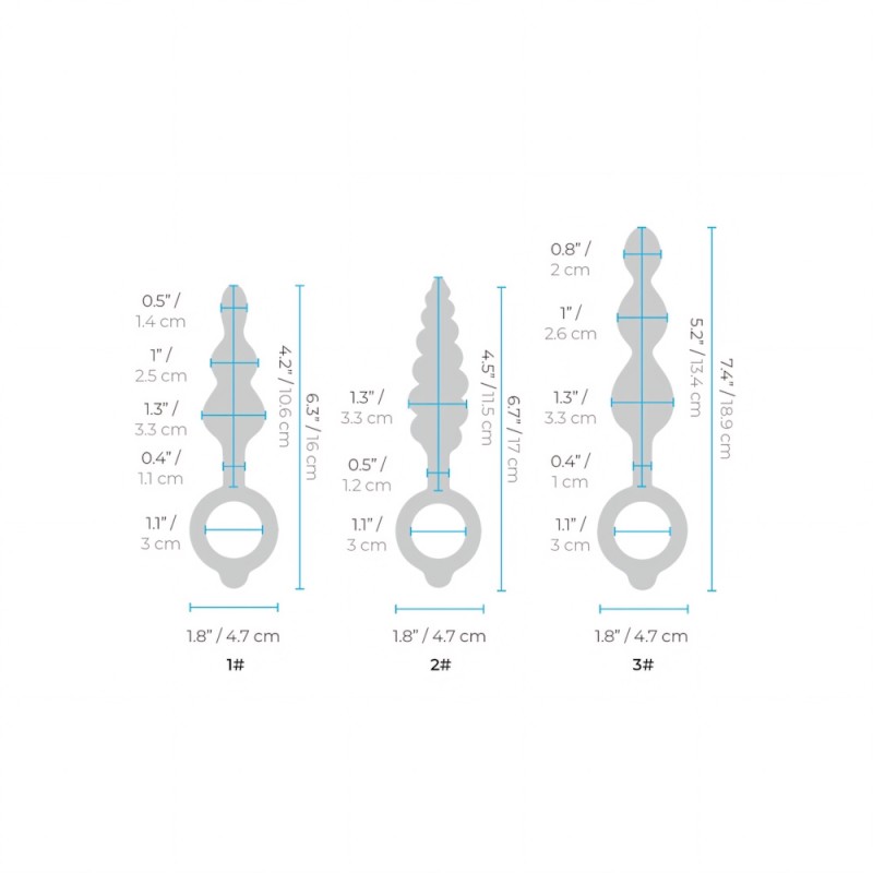 Size up your stimulation with b-Vibe's Beaded Butties Bundle. This set of three graduated plugs lets you pop into pleasure with gradually increasing beads that massage your sphincter with each thrust. The three sizes of plugs let you size up or down for anal training, and the texture variety provides three different thrilling styles of stimulation. All three plugs are 100% waterproof for use in the bath or shower and allow for easy cleaning.