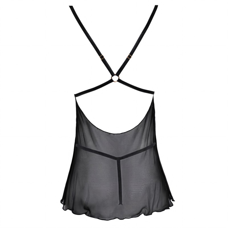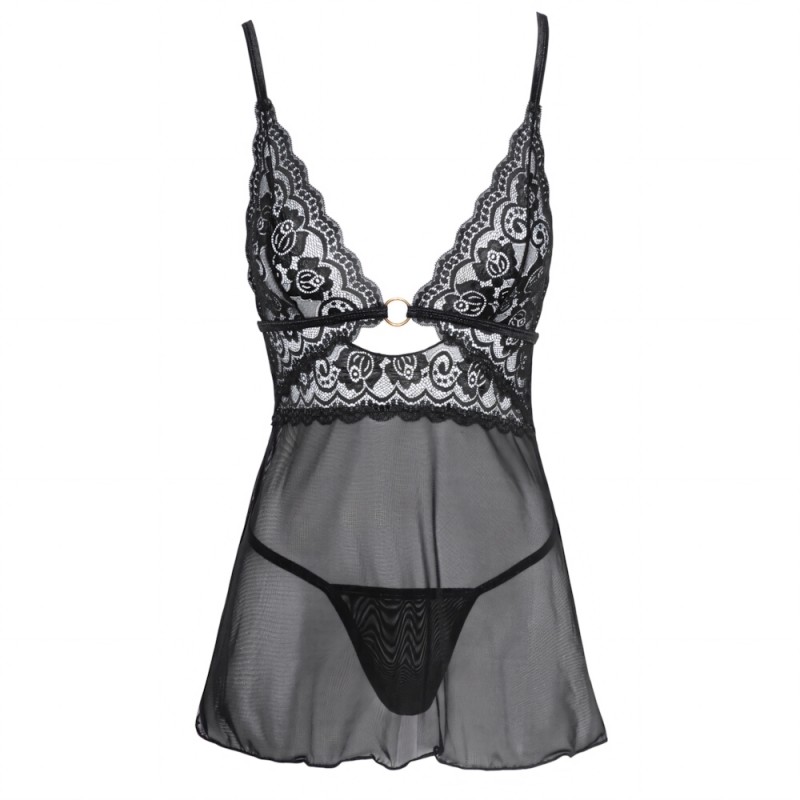 Short babydoll from Cottelli Lingerie made out of stretchy, delicate Powernet. The babydoll has lace cups that are held together by a gold-coloured ring. The strap underneath the breasts and the bra straps join together at the back and are also held together by a gold-coloured ring. The bra straps are adjustable. Includes a classic, Powernet string.