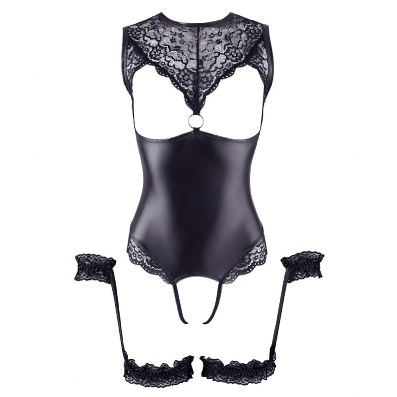 Crotchless high-neck body in matte look. It has open cups and has beautiful, delicate floral lace in the cleavage area and at the back. A silver-coloured decorative ring at the front and lace around the legs complete the erotic ensemble. The open crotch is sensually highlighted by stretchy straps. Includes 2 garters that have lace handcuffs sewn to them.