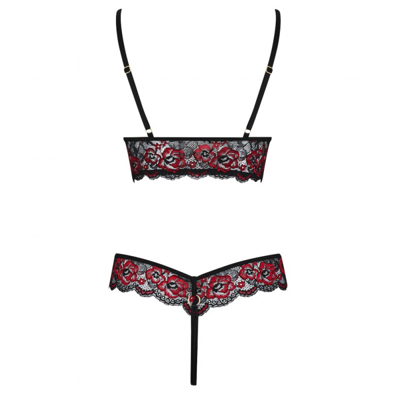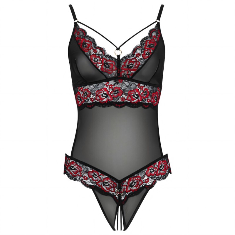 Body from Cottelli Lingerie made out of floral lace that is in two different colours. There is also a transparent Powernet on the cups and over the stomach. There are stretchy straps and decorative rings in the cleavage and waist area. It is invitingly open in the crotch area. It is in a two-piece design at the back. The straps can be adjusted for a perfect fit.