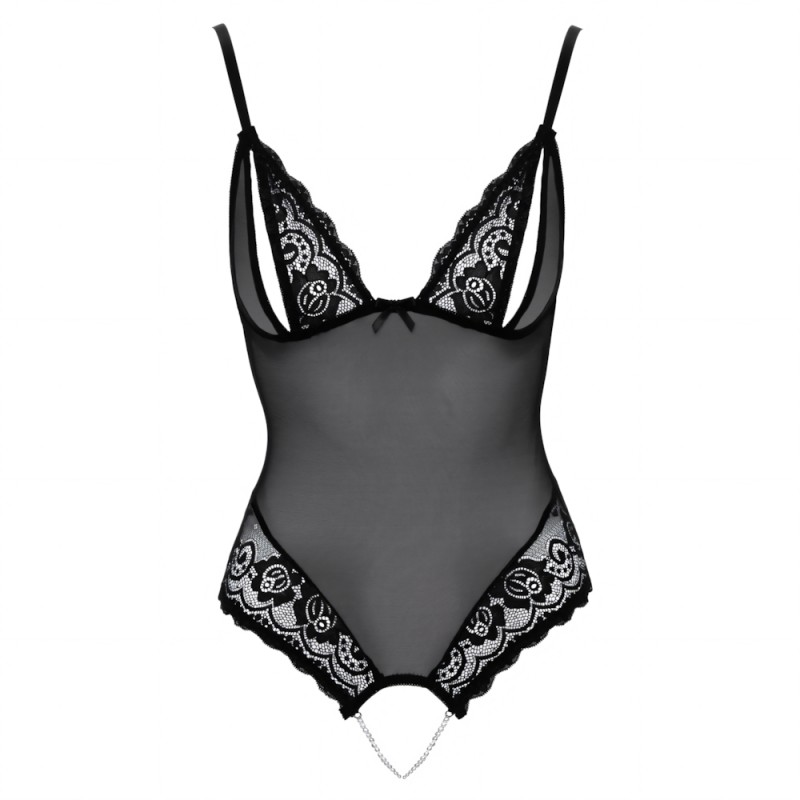 A breathtaking crotchless body with slits in the cups and stimulating rows of pearls in the crotch area. Made out of semi-transparent powernet with floral lace. With adjustable straps.