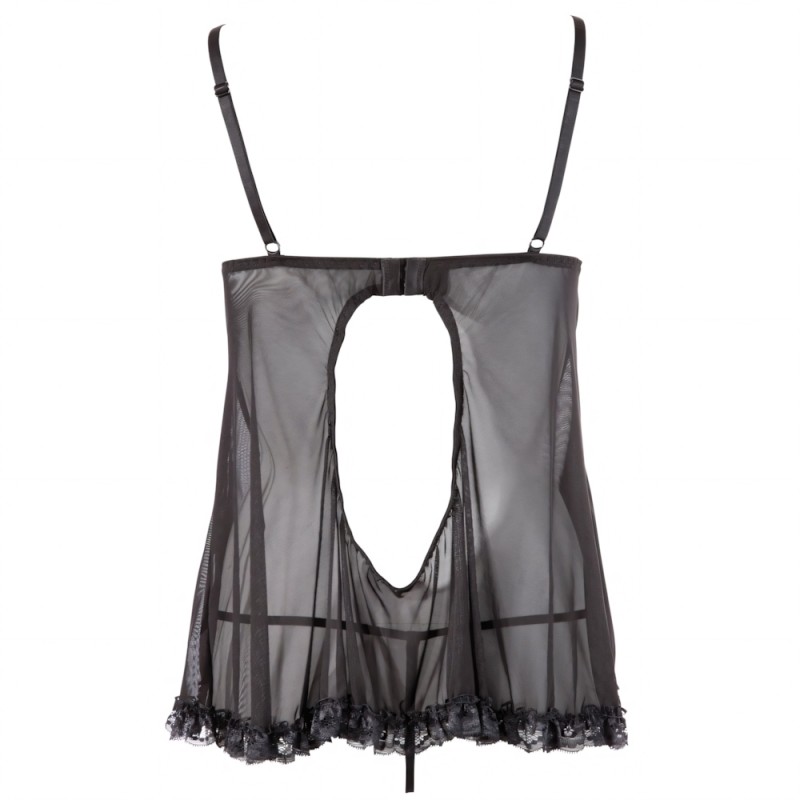 Babydoll with adjustable straps and hook closure at the back. The open cups, which can be closed with a small bow, are ruffled, the hem is made of lace. Including string.