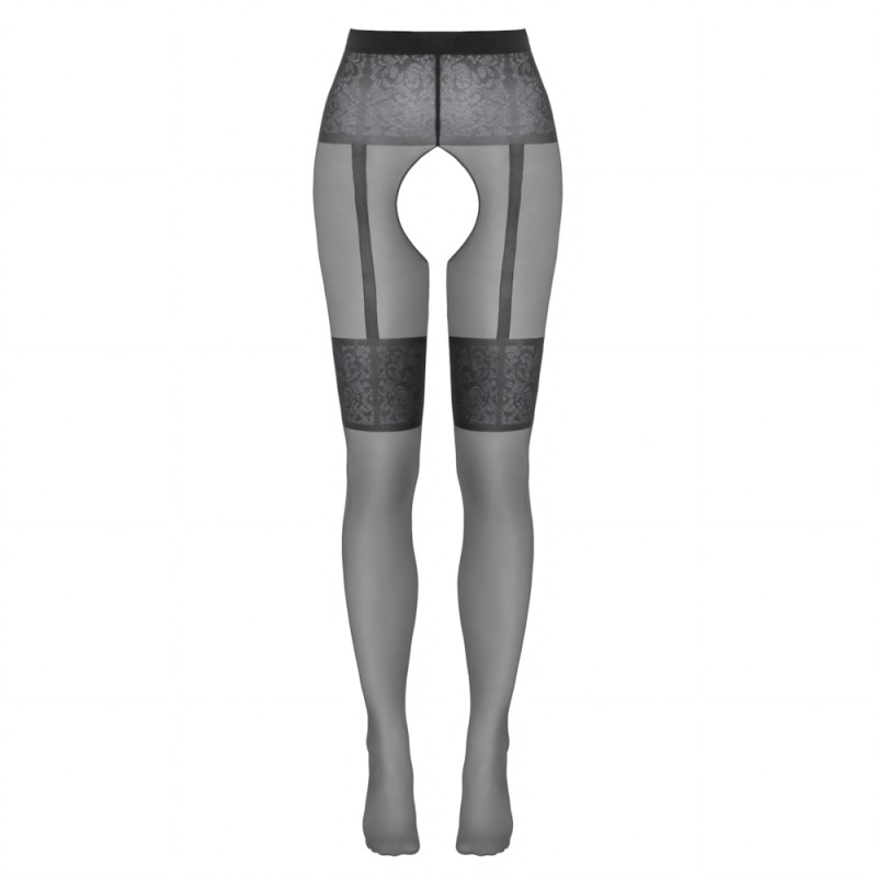 Black, crotchless tights from Cottelli LEGWARE with a woven-in suspender belt and wide garters in an elegant lace look. The crotch is wide open, the feet slightly preformed. Yarn weight 20 den. Oeko-Tex certified.