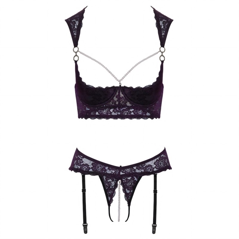 Longline lift and suspender roistering ouvert combined in the set from Cottelli LINGERIE. Made of dark purple lace with black details, decorated with silver rings and white beads. The underwire with lightly padded cups brings the breasts into top shape and directly into view. The pearl necklace that frames the breasts is removable with its small snap hooks. Refined strap solution with lace on the shoulders, and a small fastener at the neck. The straps and hook closure are adjustable in the back. The Garter Rio seduces with a stimulating pearl necklace in the open crotch, which is removable just like the 6 adjustable suspenders.