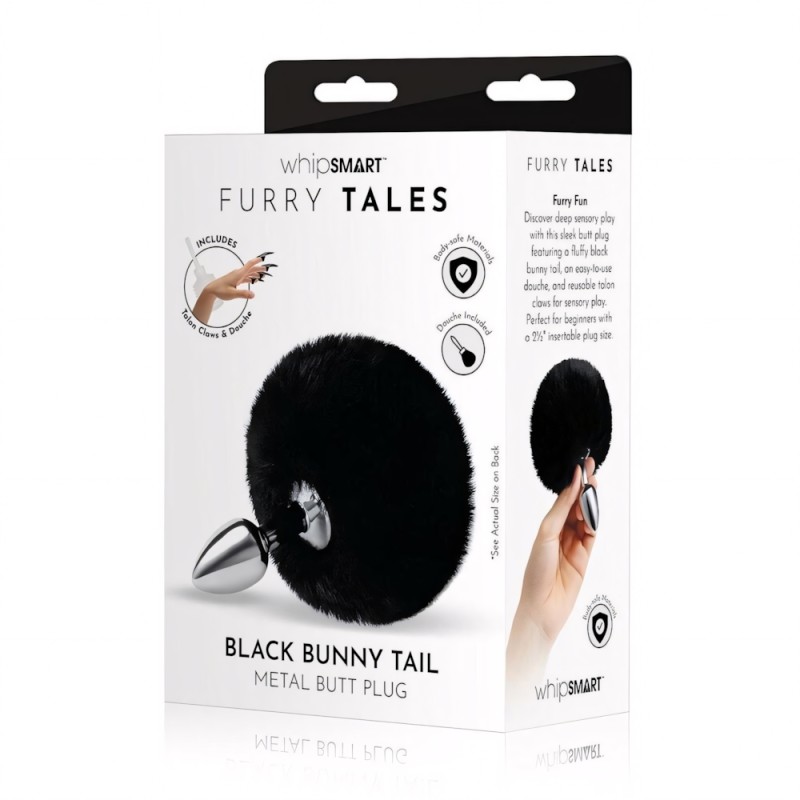 Hop into satisfying backdoor play while exploring wild fantasies with this convenient set. Made of sleek metal, it features a fluffy, black bunny tail attachment for a playful look. This 2.5-inch plug is perfect for beginners and comes with reusable talon claws for added sensory pleasure, as well as an easy-to-use douche.