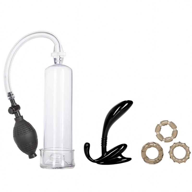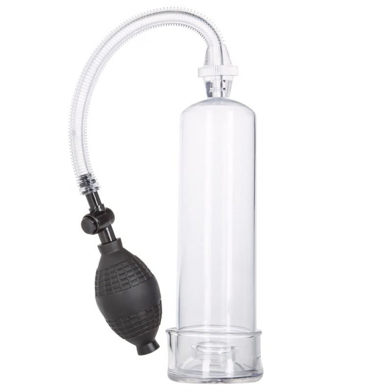 Penis pump with flanged base for superior suction and EZ-squeeze bulb with quick air release valve