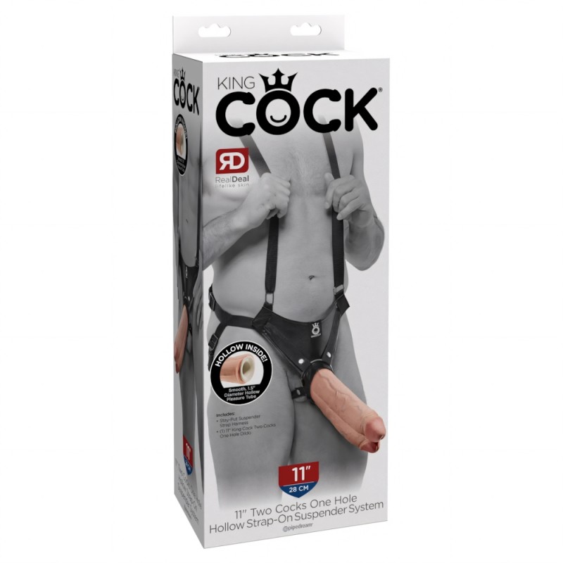 The King Cock Two Cocks One Hole Hollow Strap-On Suspender System is phthalate-free and made in Pipedream's state-of-the-art USA manufacturing facility. A long, hollow plastic tube, measuring 1.5 inches, 3.8 cm in diameter, is placed inside the rubber dong, making it perfect for men with performance problems, though it's sturdy enough for all sexes to wear.