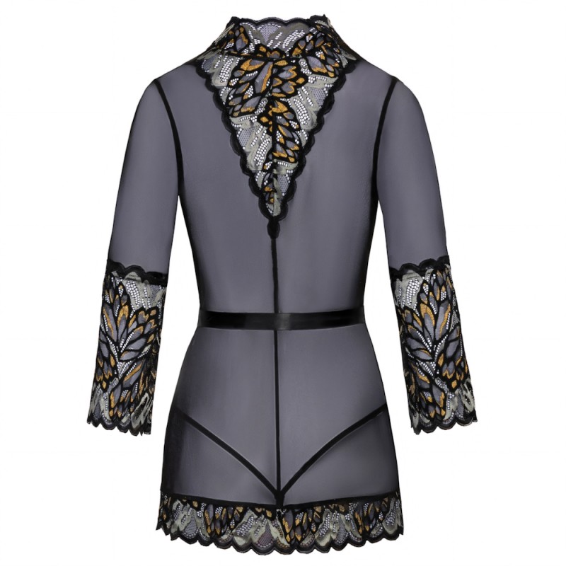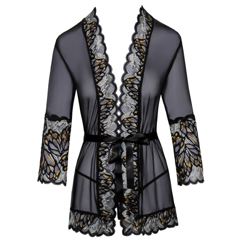 A short kimono from Kissable that covers the bum and is made out of delicate powernet and elegant lace. It is soft and stretchy for a comfortable fit, with 3/4 sleeves and a satin belt that can be tied together.