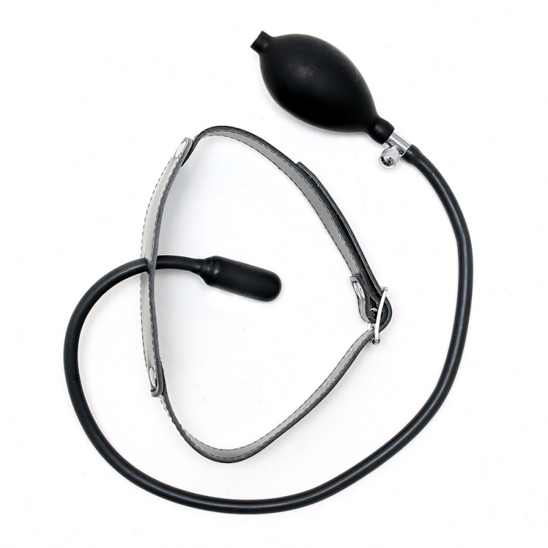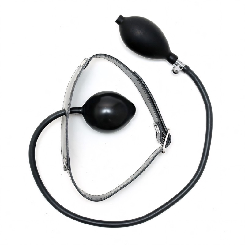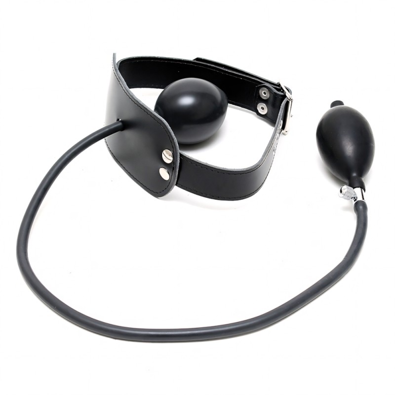 Genuine leather gag with inflatable balloon and pump, adjustable with buckle.