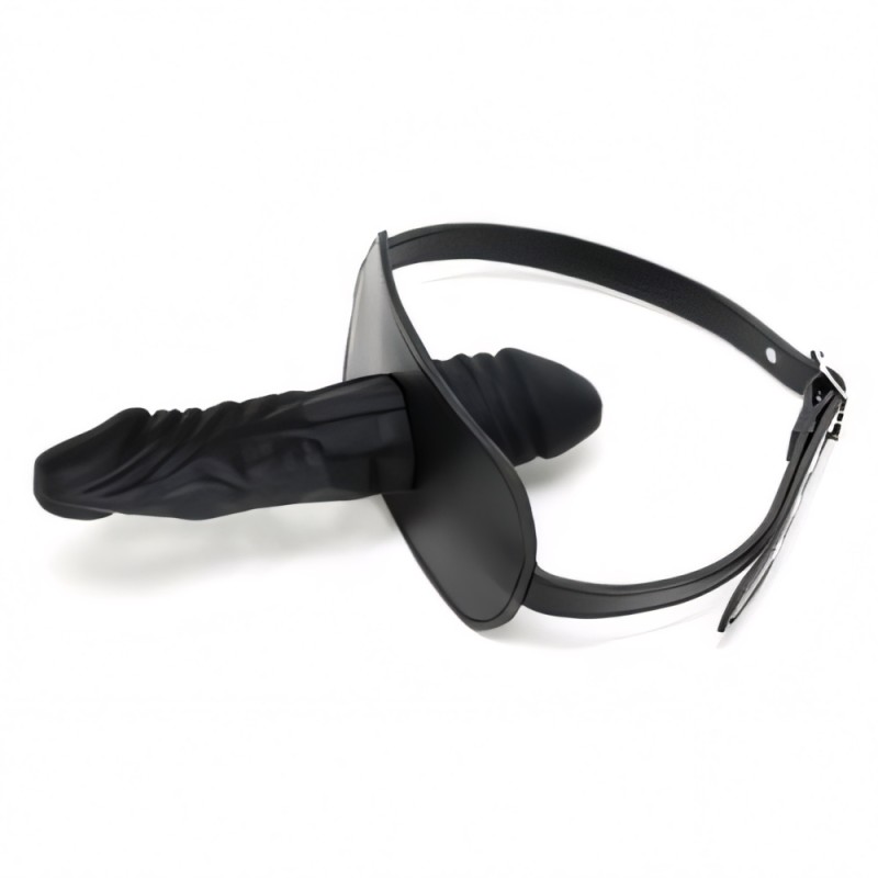 Genuine leather gag with internal and external dildo, adjustable with buckle.