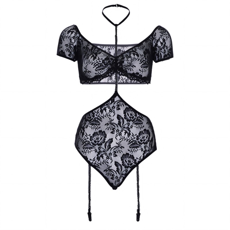 2 Piece Lace bandeau top with cuff sleeves and halter harness garter teddy.