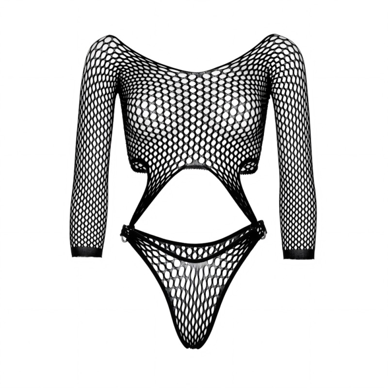 Long sleeve pothole suspender top bodysuit with thong back and O-ring detail. One Size UK 6 to 12