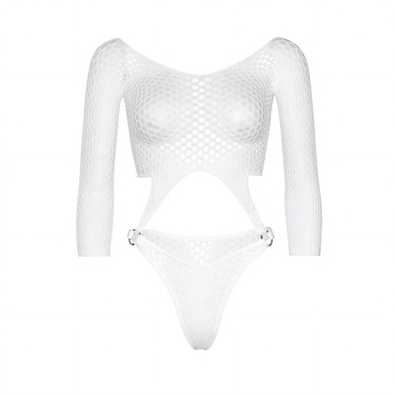 Long sleeve pothole suspender top bodysuit with thong back and O-ring detail. One Size UK 6 to 12