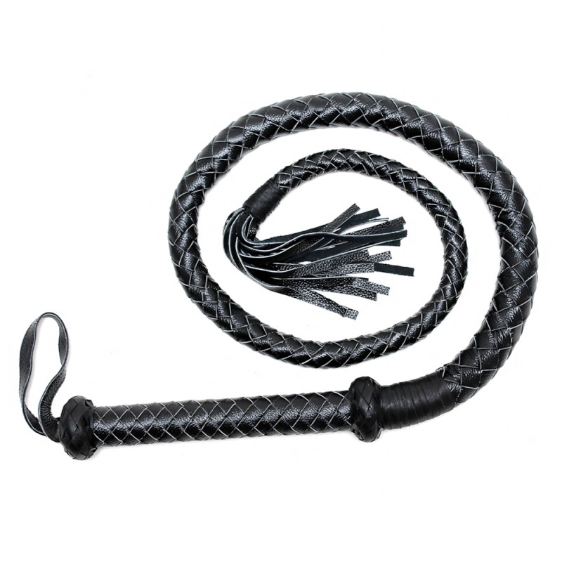 High quality Arabian leather whip in black. Solid 11 inch handle with 54 inches of platted leather and 7-8 inches of leather tassels at the end
