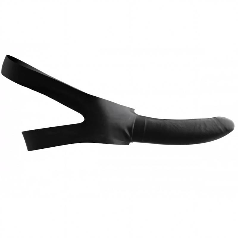 Get up close and personal with the Face Fuk from the Master Series. This stretchy, all latex strap on is designed to fit over the mouth or chin. You or your plaything can use it as a gag, or wear it on the chin which leaves the tongue free to roam as the dildo penetrates. The rigid black dildo is nice and stiff, with just enough give to the lifelike shaft. Comfortable and sturdy, the stretchy rubber straps run behind the head and beck, keeping it in place and stretching to fit most any size and shape.