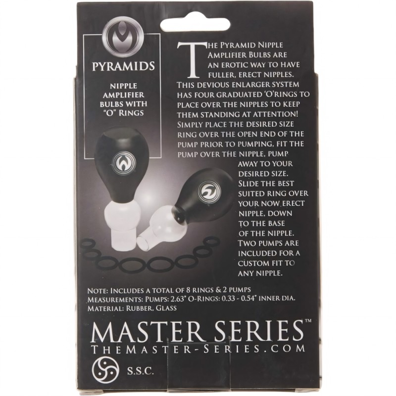 The Pyramid Nipple Amplifier Bulbs are an erotic way to have fuller, more erect nipples. This enlarger system has four graduated O rings to place over the nipples to keep them standing at attention! Simply slip the desired size ring over the open end of the pump prior to use, fit the glass pump over the nipple, and squeeze until you reach your perfect size. Then slide the stretchy rubber ring down over your engorged nipple, until it reaches the base. Two different sized pumps are included, for a custom fit on any size.