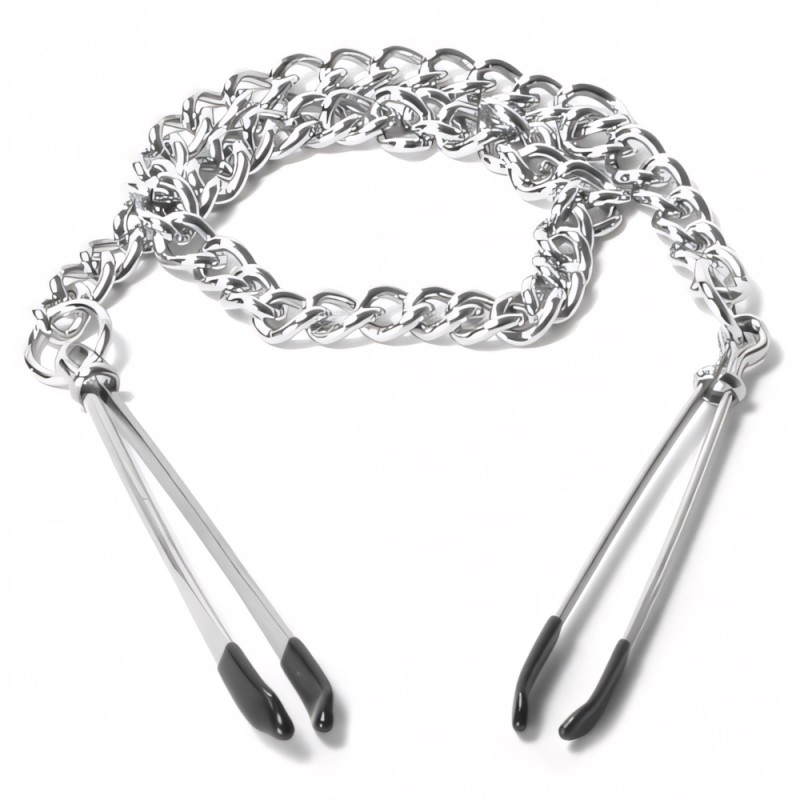 These sexy tweezer nipple clamps are designed to exert either light or strong pressure with a simple sliding clamp. Vinyl coated ends attached to a linked chain. Your plaything will love the variation between light and intense pressure, and the chain serves as a visual adornment for a sensual look.