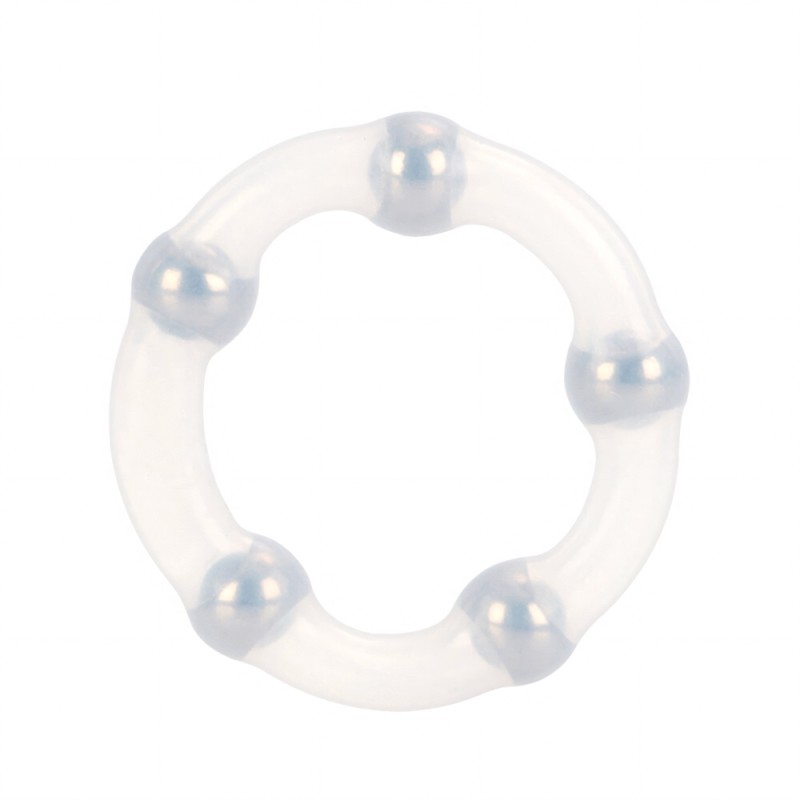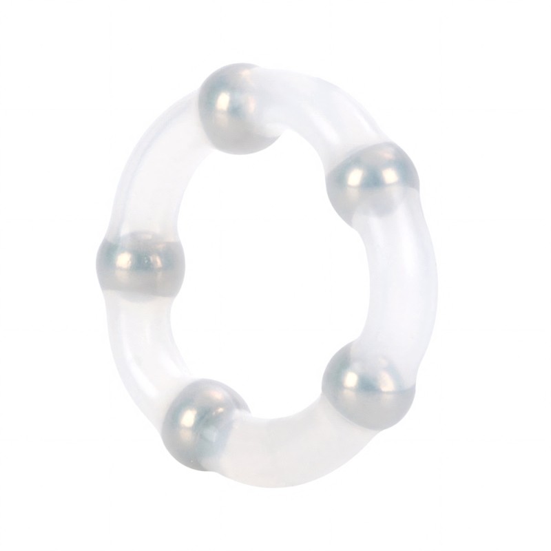 Stretchy enhancement ring with metal beads for stimulating tactile sensations. (Realistic dildo not included)