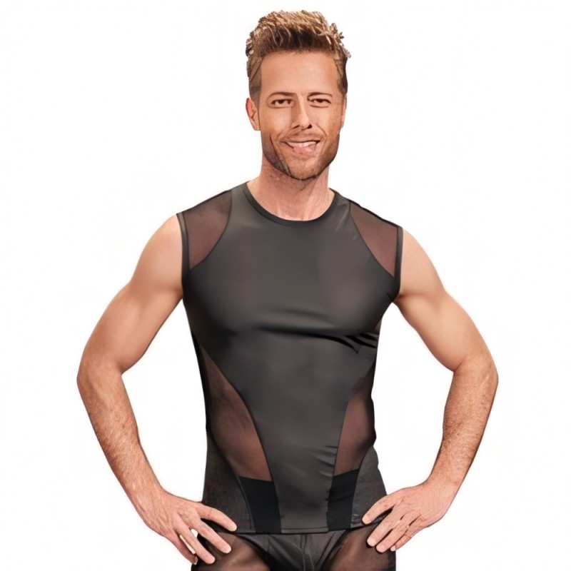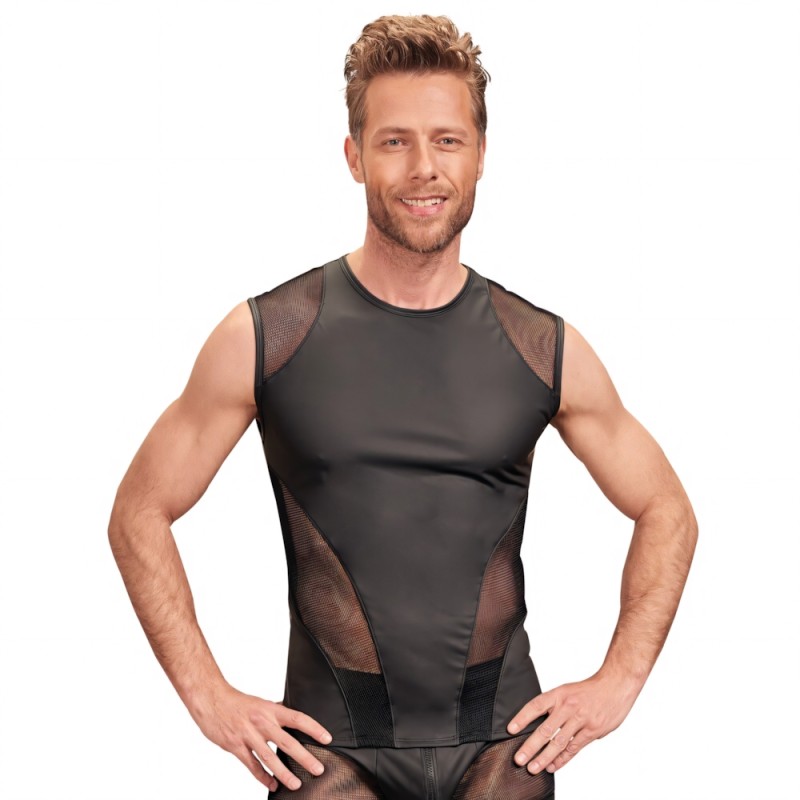 Sleeveless, black shirt from NEK made out of emphasising matte look material with transparent net inserts at either side at the front and over the front of the shoulders Wonderfully soft and stretchy shirt that is extremely comfortable to wear.