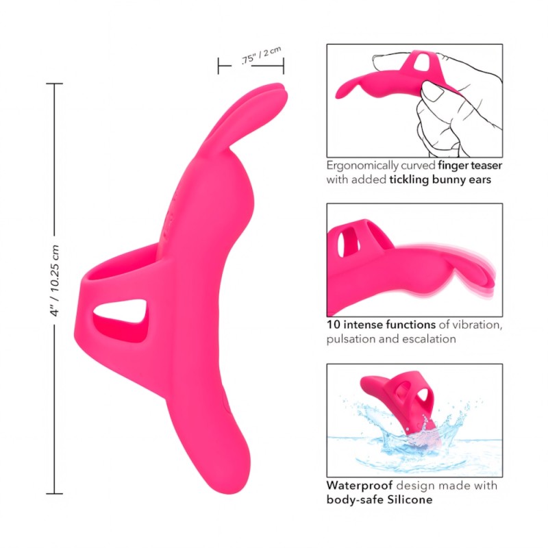 The playful finger vibe indulges your every fantasy with 10 functions of vibration and tickling bunny ear teasers. The contoured finger shape and ultra-plush silicone are made to explore sensual sweet spots and pinpoint intimate desires with ease. The flickering ears and contoured body let you deliver thrilling vibrations from any angle you desire. The stretchy and comfortable finger loop allows any user to play with ease.