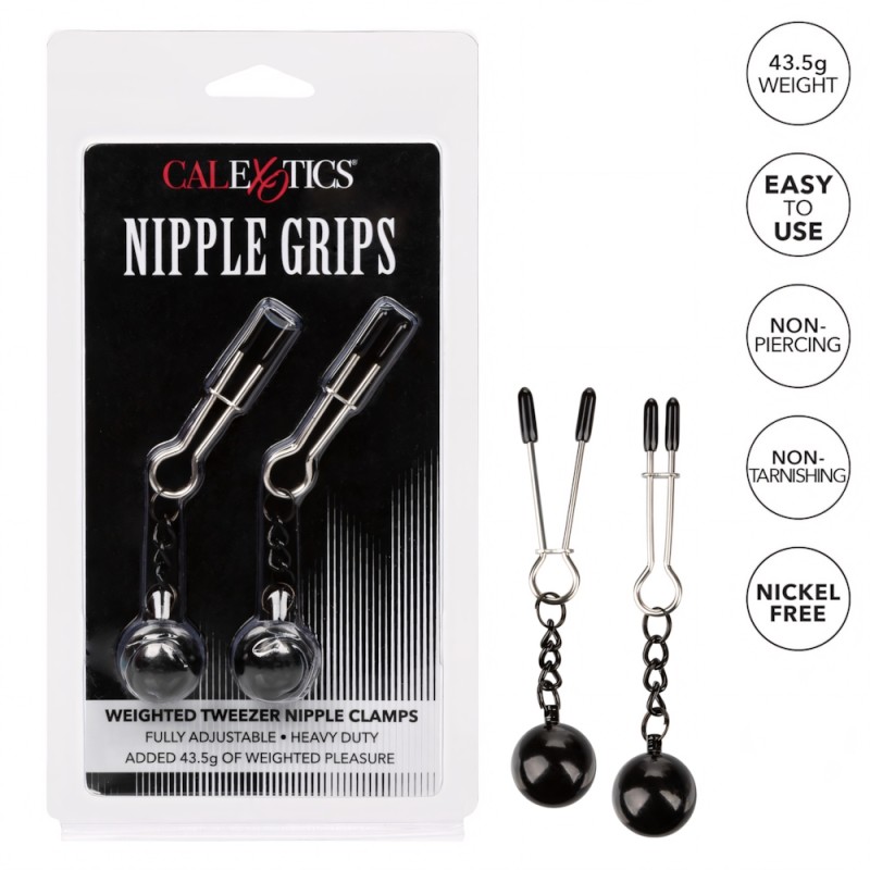 Tweezer-style nipple clamps give you the right amount of squeeze for an incredible nipple play experience. Adjust the tweezers to exactly the pressure you desire, and let the weights pull and tug for even more pleasure.