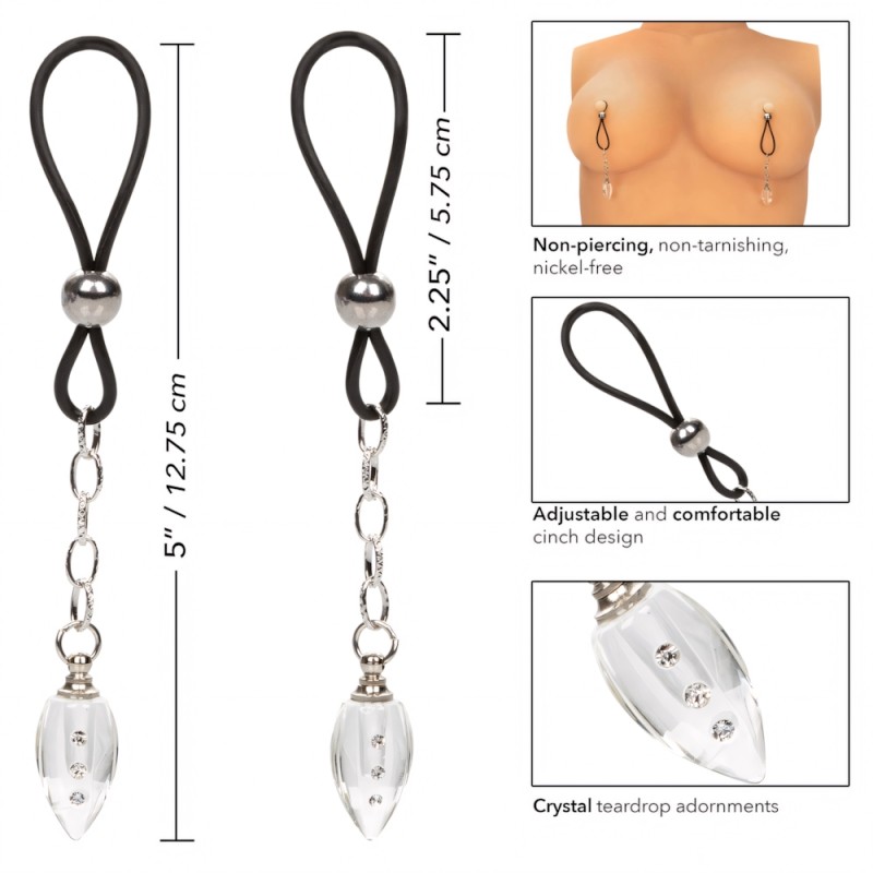 Push sensation to the next level and enjoy teasing nipple play with the Nipple Play Non-Piercing Nipple Jewelry Crystal Teardrops. Explore elevated sensation with the 2 fully adjustable nipple jewel adornments, pliable cinch and sparkling crystals. One glance at the sparkling crystal jewels will inspire frisky fantasies and make your lover's appetite water. Inspire feelings of sensuality, confidence and arousal when you tighten the slip cinch.
