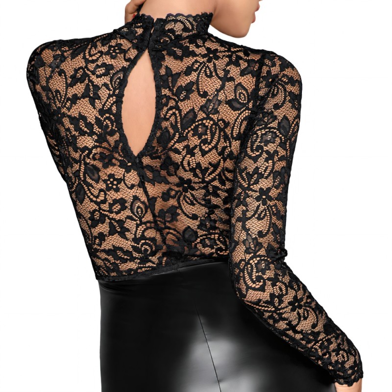 Knee-length long-sleeved dress in a tight tailored cut in a noble black mix of soft lace, top, and matt-shiny power wet look, skirt part. Small stand-up collar to close with 2 buttons at the back. Small slit in the back hem.