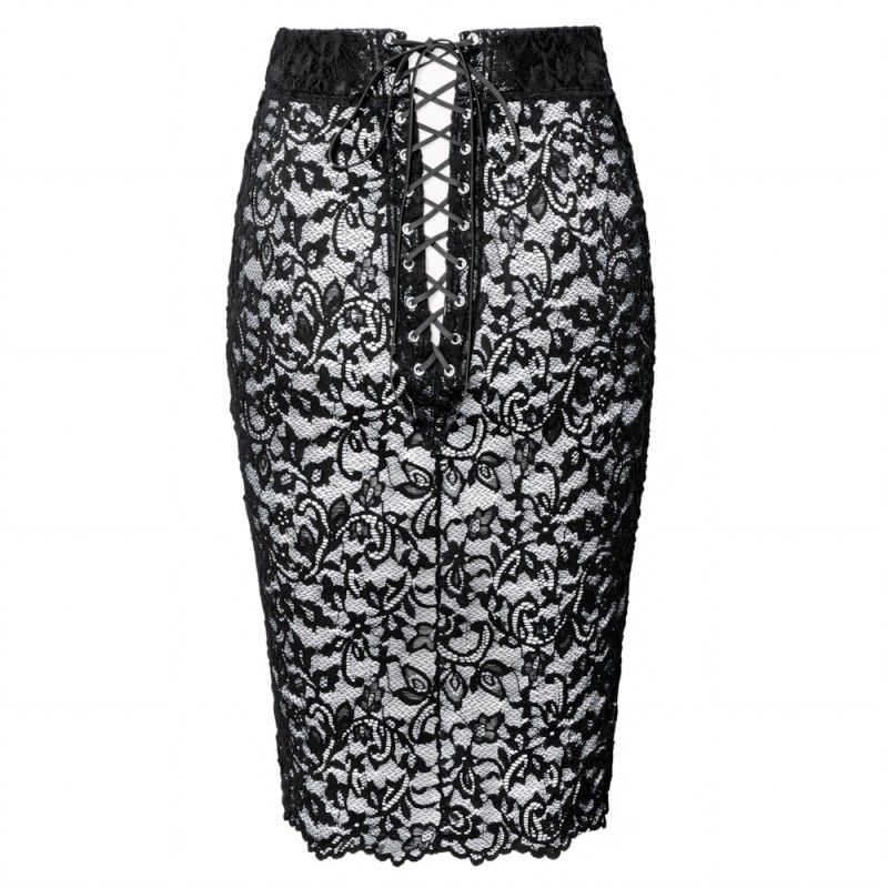 Tight, waist-high pencil skirt by Noir in knee-length. Black, elegant mix of materials: matte, shiny powerwetlook at the front, made entirely of fine lace at the back. The waistband is also covered with lace at the front. The skirt is soft and stretchy for great comfort. Particularly seductive back view with variable, open lacing from the waist to the bottom.