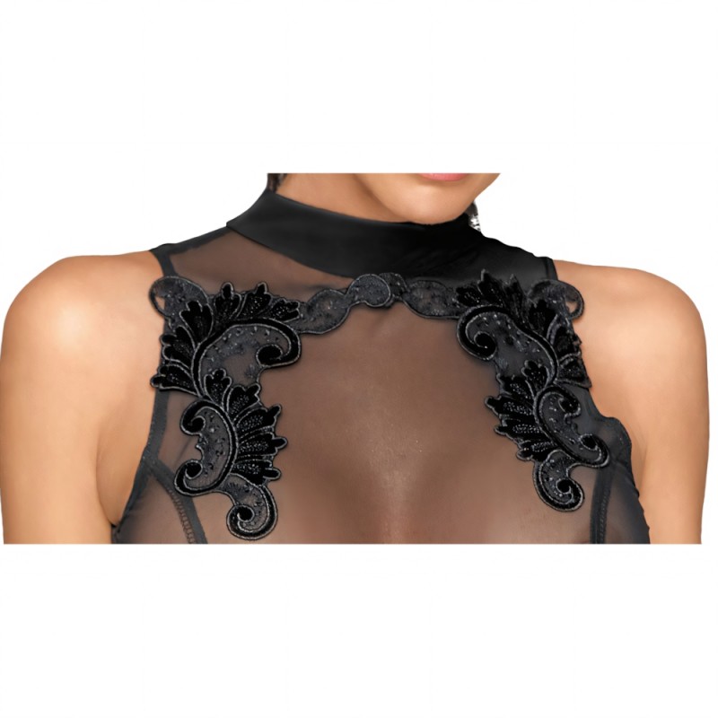 Elastic, sleeveless dress in a tight, figure-hugging cut in a noble black mix of Powernet (top) and Powerwetlook, skirt part. Above the cleavage with elegant embroidery. At the back with an extra-large neckline to the bottom. The small stand-up collar is closed with three buttons. The skirt has a small slit at the back.