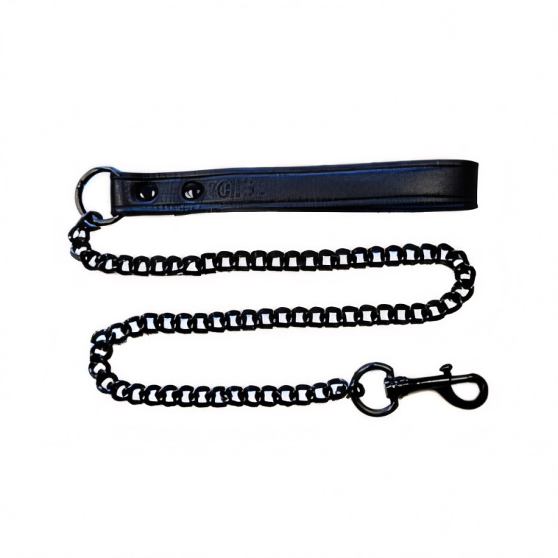 Leather lead with a black colour metal chain and a trigger hook on one end.