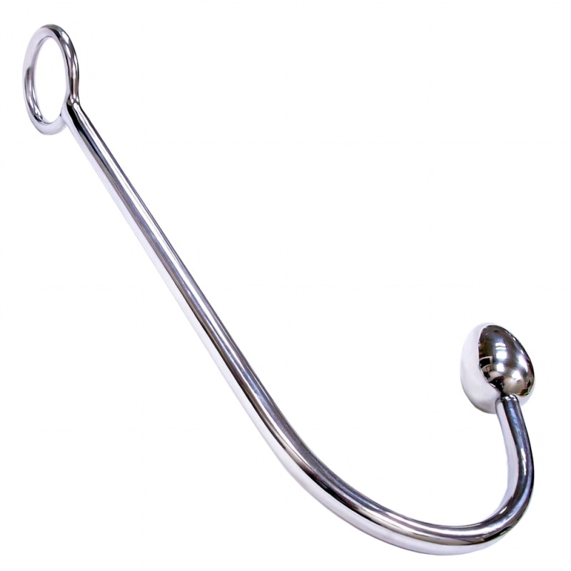This impressive steel hook can be hooked up to ropes and other bondage equipment, making sure it keeps a strong hold on its wearer. There's 5" of insertable length (the ball and a portion of the hook). The hook then rests against the back, while the ring (1.5" in diameter) is used to connect to ropes.