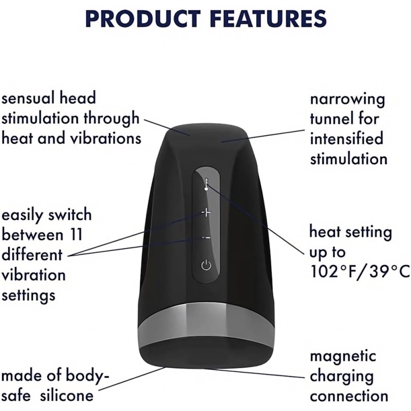 The Men Heat Vibration combines a masculine design with a simple, intuitive operation using the on/off and plus and minus buttons you can control it comfortably with one hand, even when things get a little wild. Thanks to its wide opening, you can use the masturbator even when your penis is not erect and warm yourself up from 0 to 100 in no time at all.