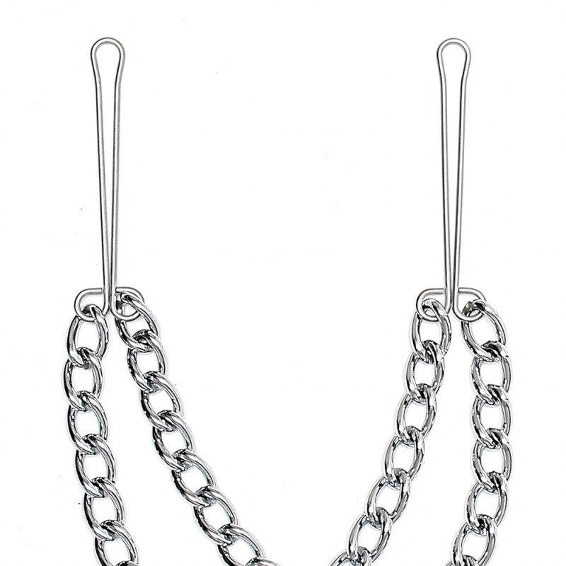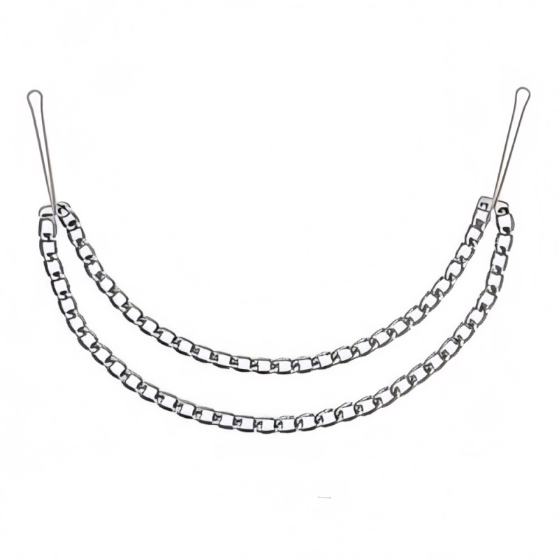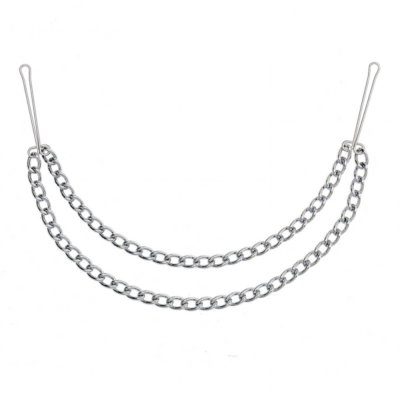 Silver nipple clamps and Double chain which just easily attach to the nipple