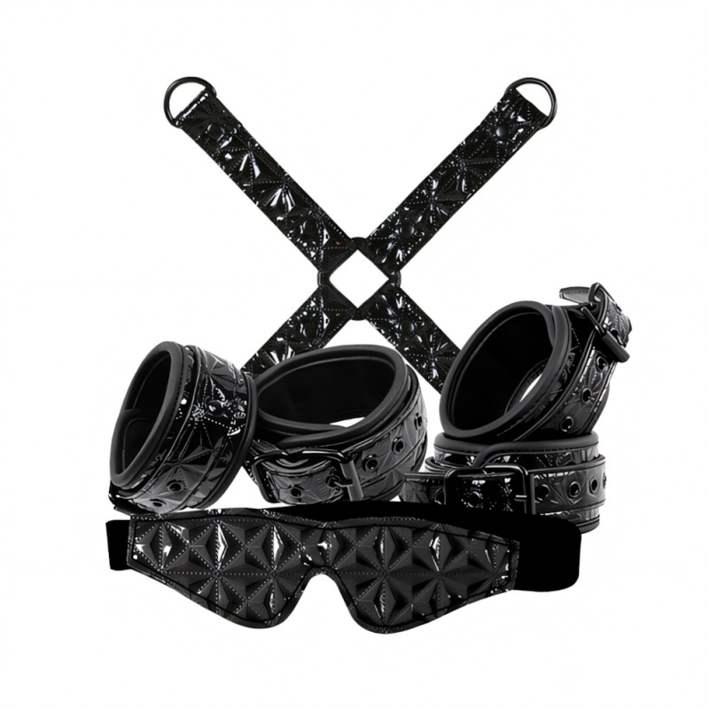The kit contains everything needed for a night of BDSM pleasure, luxurious restraints that will please both entry level as advanced lovers. The set includes ankle cuffs, wrist cuffs, a hog tie and a chic blind fold. All the products in the Sinful Bondage Kit have a trendy quilted surface and come with adjustable fastenings.