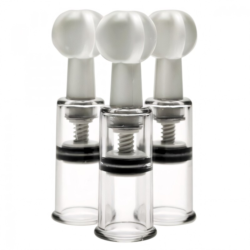 Enjoy powerful suction with this triple set of demurely sized suction cylinders. Just apply to any area that would benefit from increased sensitivity and blood flow, no pumps or accessories needed. These self-contained suction devices work with a simple twist. Silent, simple, and discreet, these suckers can be taken and used practically anyway for on the go stimulation. Lubed internally for smooth movement and a strong seal that makes for sublimely powerful suction. Measurements: Opening is 0.75 inches in diameter, tube is 2.35 long and entire item is 4 inches long.